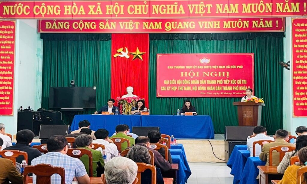 Bà Nguyễn Thị Xuân Trang – Ủy viên BTV Đảng ủy, Chủ tịch Ủy ban MTTQ Việt Nam xã Đức Phú chủ trì hội nghị. Tổ đại biểu HĐND thành phố gồm: Bà Nguyễn Thị Thu Lan – Ủy viên BTV Thành ủy, Bí thư Đảng ủy, Chủ tịch HĐND Phường Tam Kỳ; Ông Nguyễn Văn Diệu – Phó Chánh Văn phòng HĐND thành phố; Bà Phạm Thị Thanh – Thành ủy viên, Bí thư Đảng ủy, Chủ tịch HĐND xã Tam Anh đã tiếp xúc cử tri các xã: Đức Phú và Tam Mỹ.