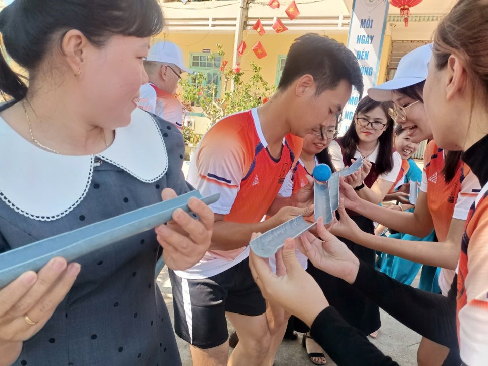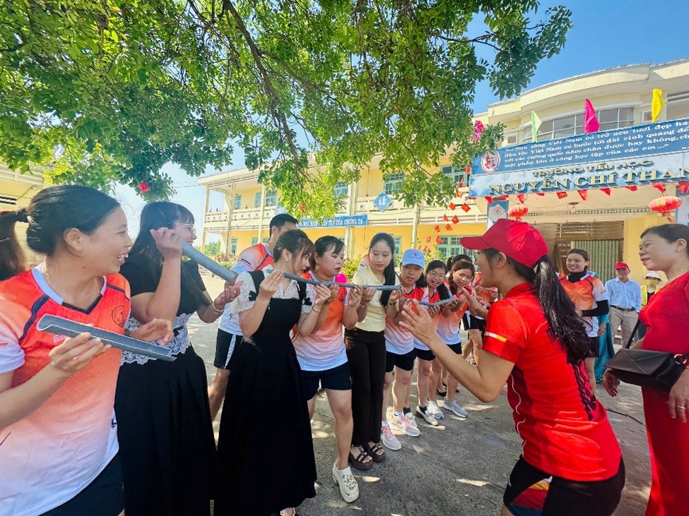 Bên cạnh đó, các trò chơi nhỏ tập thể cũng được tổ chức với sự tham gia tích cực của giáo viên hai trường. Những trò chơi vui nhộn không chỉ mang lại tiếng cười, sự thư giãn mà còn góp phần gắn kết tập thể, tạo thêm sự gần gũi, thân tình giữa các thành viên.